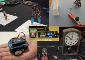 We will show mini balancing robots that have only two wheels and try to keep standing by moving the body back and forth. Some of the robots can be maneuvered by the wireless remote control. We will set up a small soccer field and visitors can try to shoot a ball to the goal. We will also show mini line-following robots.