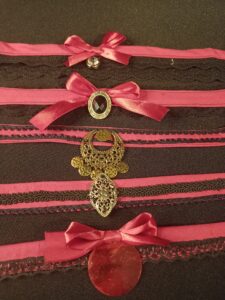 Každý účastník workshopu si může vyzkoušet jak se šije a zdobí šperk na krk (choker), který si pak odnese domů. Budeme používat hlavně jehly, nitě, krajky, korálky, stužky a řetízky. Ukázky již hotových šperků budou k dispozici pro inspiraci. 🙂