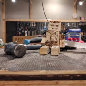 Na letošním Maker Fairu si u nás vyrobíte ze dřeva panáčky ve stylu minecraftu. Jako každý rok bude na našem stánku i paleta s volnou tvorbou (nejen) pro děti.