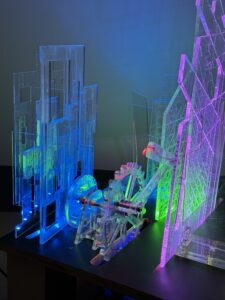 Výběr z tvorby Ateliéru umělce Lishowna. Kinetické světelné prototypy experimentující s analogovým přístupem, projekce či papírový pop-up.