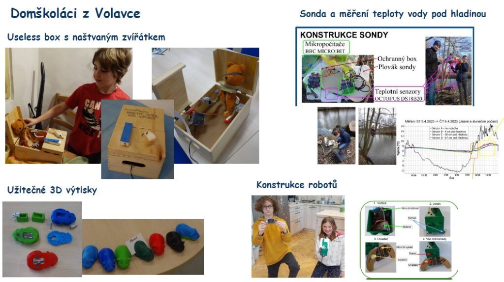 Ahoj, jsme parta dětí a chceme vám ukázat pár věcí co jsme postavili. Štěpík tu má useless box s neposedným zvířátkem a hromadu užitečných 3D výtisků. Barča s Vojtou vám ukážou svoji sondu s kterou zkoumali co se děje pod hladinou rybníka. Áňa s Frantou vám ukážou svého robota. Rádi se s vámi potkáme a probereme, co a jak by se dalo postavit.