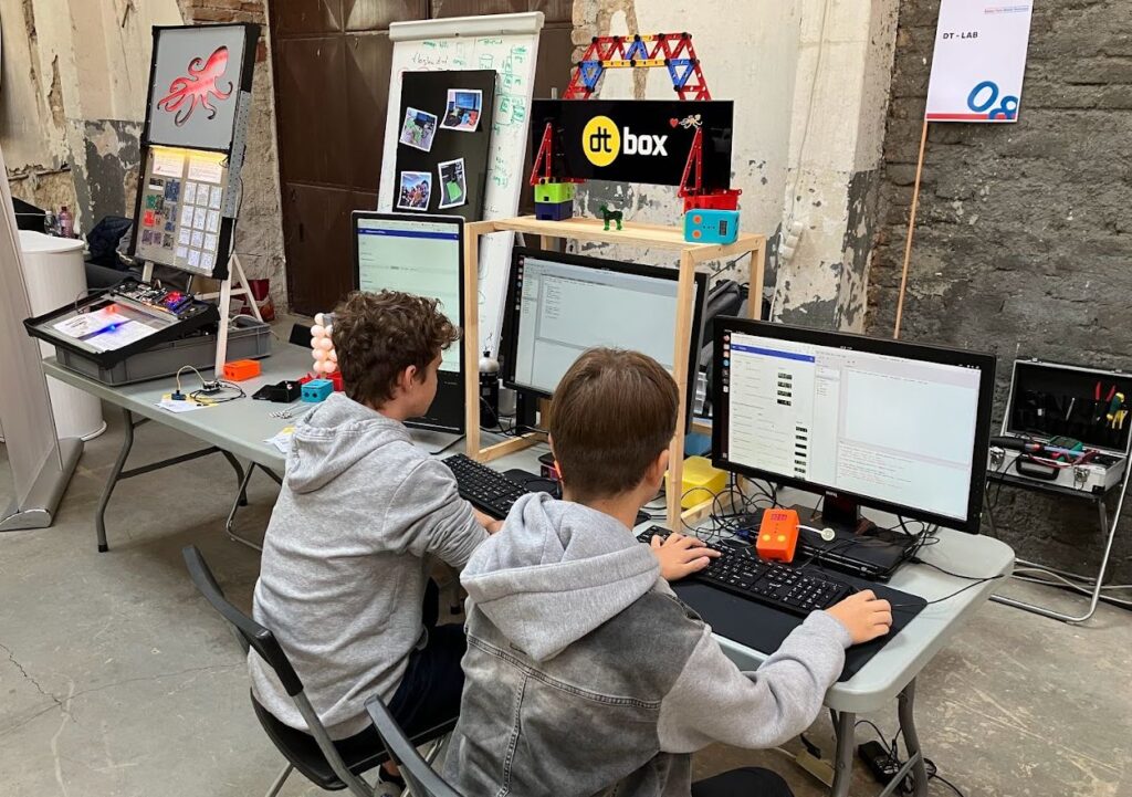 DT-Box je krabička pro objevování světa programování a digitálních vychytávek. Zdrojový kód se píše v Pythonu a je pro úplné začátečníky i mírně pokročilé. Jde nám o popularizaci psaní software, tedy bez znalosti elektroniky je možné kombinovat různé senzory a signalizaci (teplota, tlak, vzdálenost, display, LED, RGB světla, zvuky).