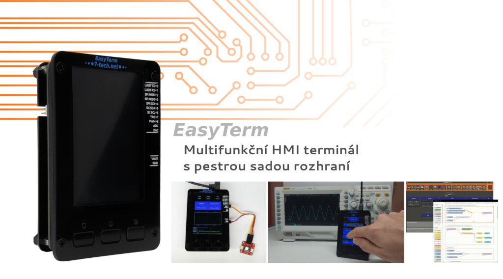 EasyTerm je český všeuměl pro takové to domácí bastlení či profesionální vývoj elektroniky. Potřebujete inteligentní dotykový displej pro ovládání Vašich vynálezů či jiných zařízení? Či potřebujete příkazově/dotykově ovladatelný signálový generátor, logger, master sběrnice I2C a mnoho dalšího a zároveň nechcete přeplnit stůl různými nekompaktními a drahými přístroji? Mimo jednoduchých a rychlých úkonů je nově připraven i pro složité automatizace. Přijďte si jej vyzkoušet či pouze poklábosit o úskalích jeho vývoje a elektronice obecně. Těšíme se na Vás! 🙂