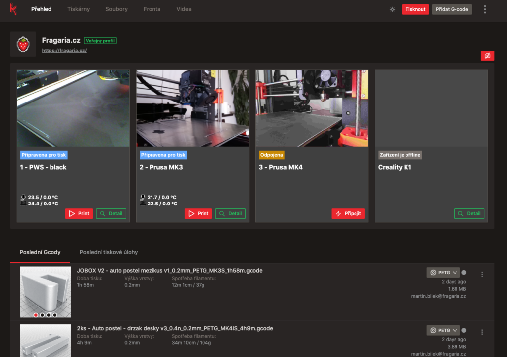Díky Karmen můžete 3D tiskárny, g-cody i videa bezpečně sdílet s kolegy (studenty, přáteli) v rámci pracovní skupiny či širší komunity.