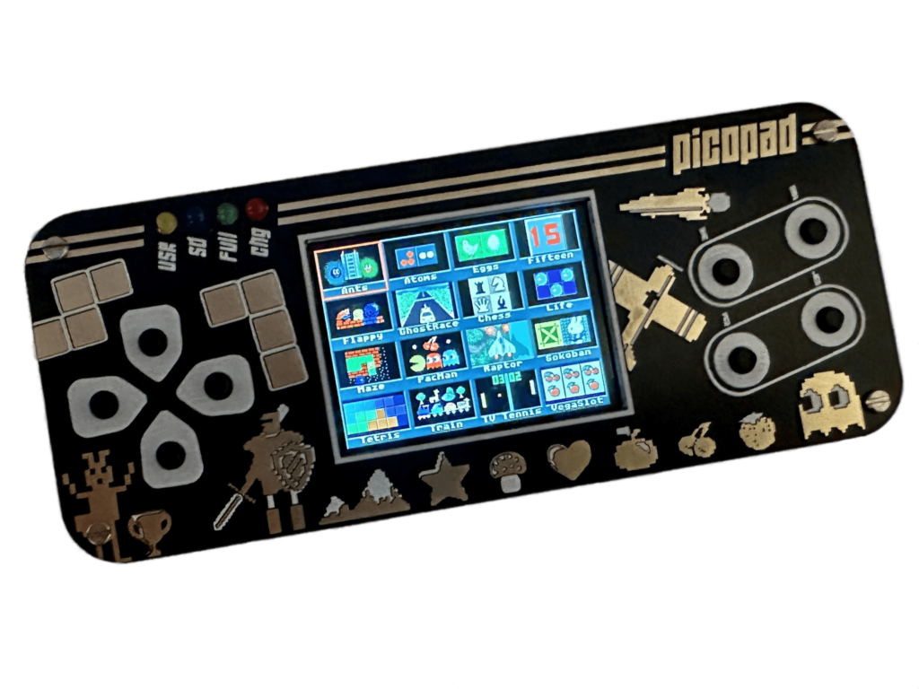 Projekt Picopad, je otevřená herní konzole postavená na platformě RP2040. Konzole obsahuje naportované hry, vlastní bootloader a C SDK. Samozřejmě také podporuje Micropython a připravujeme externí karty pro různá vzdělávací rozšíření (například senzory). Konzole bude dodávána jako stavebnice obsahující co největší součástky, aby si děti mohly samy nebo s pomocí rodičů konzoli sestavit. Původně se jednalo o konzoli oslavující 30. výročí vydání hry Vlak, ale vývoj se trochu “splašil” a dostalo se to o mnoho kroků dál.