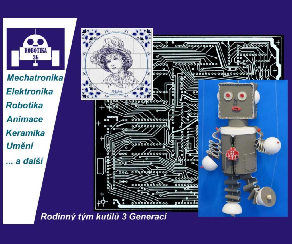 ROBOTIKA 3G je rodinný tým kutilů tří generací. Jsem to já, manželka, naše děti a naše vnoučata. Baví nás poznávat a vytvářet společně i jednotlivě nová díla. V současnosti se snažíme naprogramovat poznatky z oblasti umělé inteligence i do našich projektů a to nejen z oblasti robotiky, elektroniky, umění, animací, ale třeba i do módního návrhářství. Propojujeme různé postupy, matematické a fyzikální zákony, materiály a technologie, tím vznikají unikátní výtvory. Smyslem naší tvorby je vytvářet nové věci na základě letitých různorodých znalostí a zájmů jednotlivých členů našeho rodinného týmu.
